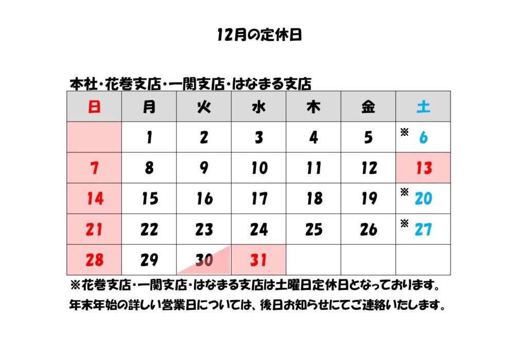 年末年始の詳しい営業日については別途お知らせにてご連絡いたしますので、よろしくお願いいたします。